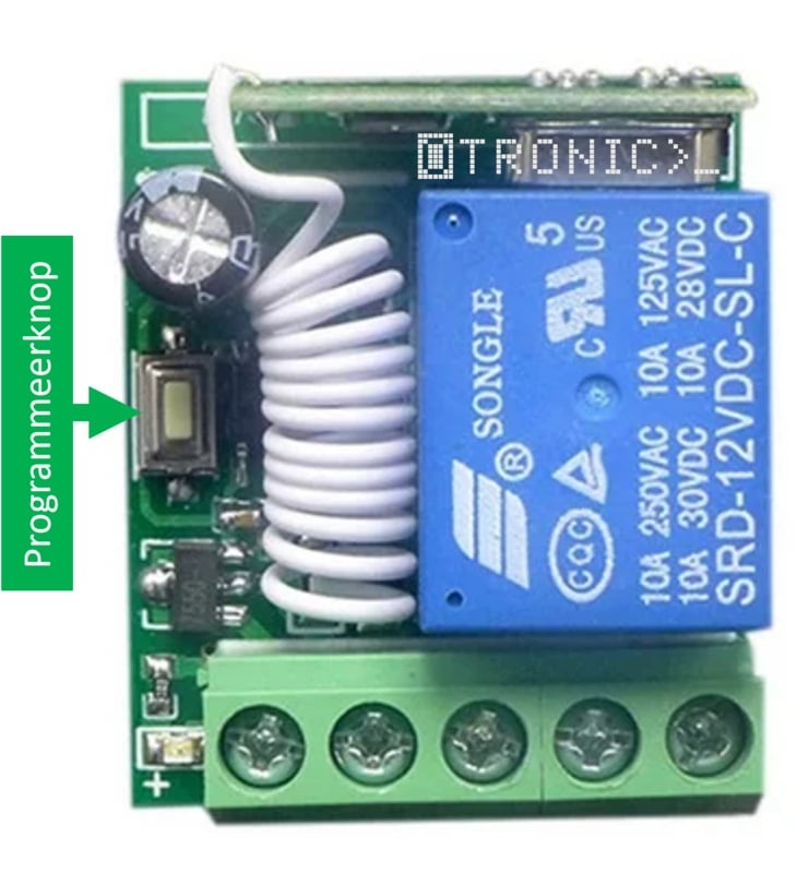 Programmierung:Drücken Sie einmal die Programmiertaste, die blaue LED auf der Platine blinkt einmal. Drücken Sie nun die gewünschte Taste auf der Fernbedienung und die LED auf der Platine blinkt zur Bestätigung 3x. Die Taste ist jetzt programmiert und aktiv.