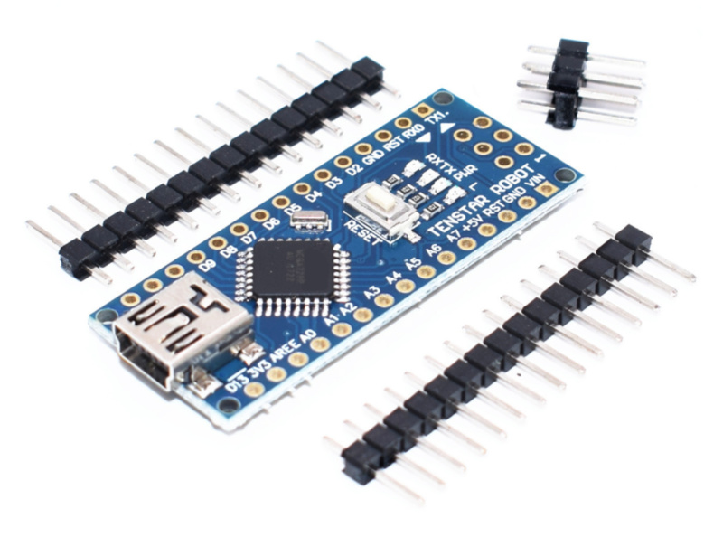 Ein Arduino Nano-Klon. Funktioniert genauso gut, ist aber deutlich günstiger. Bitte beachten Sie, dass die Stiftleisten separat geliefert werden und Sie sie selbst löten müssen.