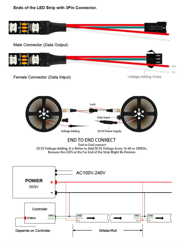 RGB-LED-Streifen mit 5 Metern Länge und 300 WS2812B-LEDs und somit separat steuerbar. Um diesen LED-Streifen zu steuern, benötigen Sie einen Controller wie unseren 5V / 3A und für eine optimale Lichtleistung ist ein 5V-Netzteil vorhanden erforderlich / 10A empfohlen.