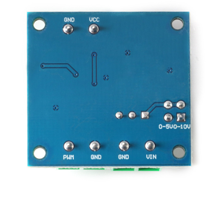 Verbinden Sie das Gerät Spannung an VCC und GND. Schließen Sie sie nicht verkehrt herum an, um Schäden an der Platine und den Geräten zu vermeiden. Schließen Sie eine einstellbare Spannung an den VIN-Anschluss an. Der Spannungsbereich ist in zwei Typen unterteilt: 0–5 V und 0–10 V, abhängig vom ausgewählten Modus mit dem Jumper. Dies ist auf der Rückseite des Schildes abgebildet. Standardmäßig ist es auf 0–5 V eingestellt.
