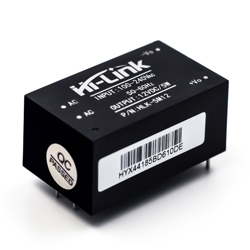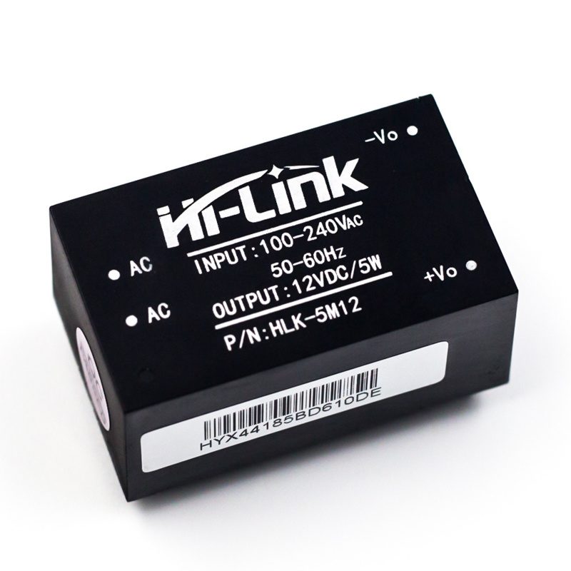 Hi-Link power supply module for soldering on a printed circuit board to convert, for example, 220V to 12VInput voltage (AC pins): 90 - 264V AC (maximum)Output voltage (+Vo and -Vo pins): 12V DCMax. output current: 0.42A (continuous)Voltage regulation: ± 0.2%Load regulation: ± 0.5%Output ripple: < 50mVType: HLK-5M12DimensionsLength: 3.9cmWidth: 2.3cmHeight: 1.8cm