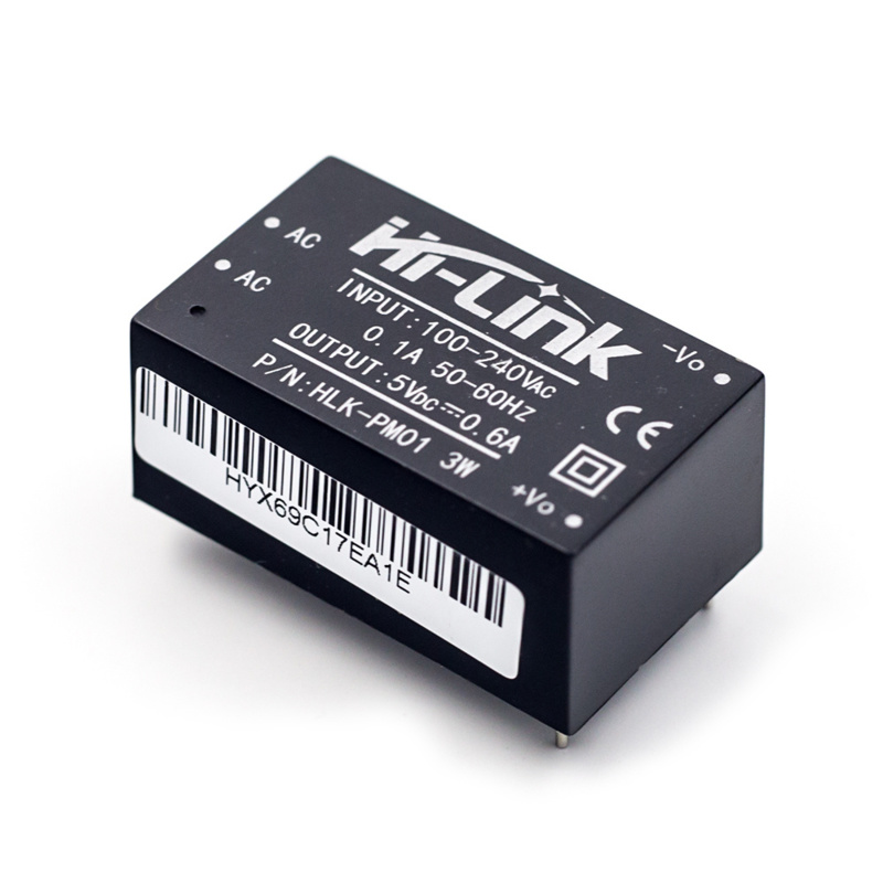 Hi-Link power supply module for soldering on a printed circuit board to convert e.g. 220V to 5VInput voltage (AC pins): 90 - 264V AC (maximum)Output voltage (+Vo and -Vo pins): 5V DCMax. output current: 0.6A (continuous)Voltage regulation: ± 0.2%Load regulation: ± 0.5%Output ripple: < 50mVType: HLK-PM01DimensionsLength: 3.5cmWidth: 2.03cmHeight: 1.51cm