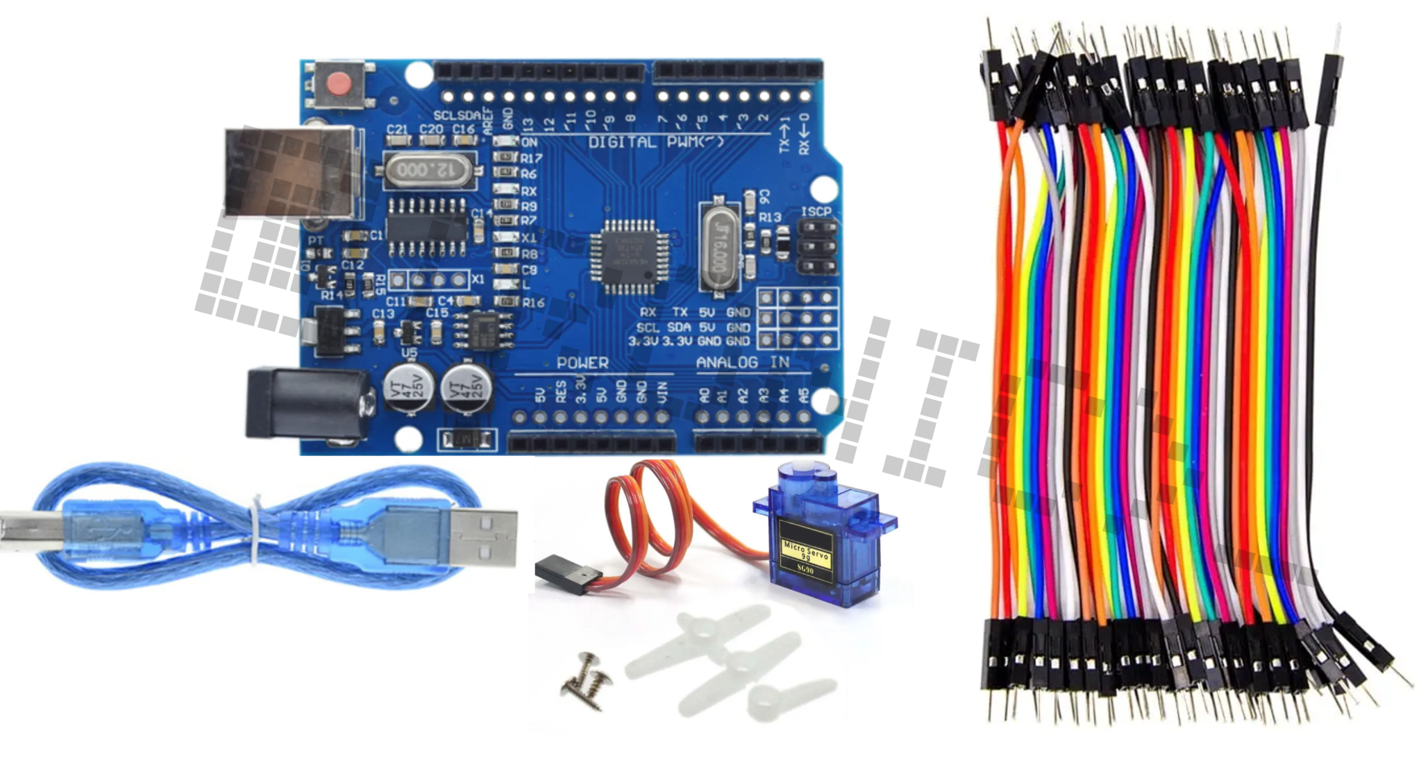 This kit contains an Arduino Uno R3 microcontroller board, essential for various electronic projects and applications. This set contains an SG90 180 degree micro servo. To easily connect the components, a set of 40 dupont cables (20cm male-male) is included.