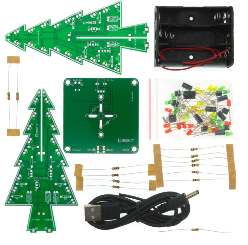 This PCB Christmas tree is a fun soldering kit. With red, green and yellow LEDs that, if soldered correctly, will flash in 3 groups. Including battery holder and USB cable. Power supply: 5V USB or via batteries (3x AA and 5V USB power supply not included) Package contents: 1x Printed circuit board CTR-30A 1x Printed circuit board CTR-30B 1x Printed circuit board CTR-30C 2x Resistor 330 2x Resistor 1K 2x Resistor 2K 7x Resistor 10K 6x NPN Transistor S90 14 6x Capacitor 47µF 16V 13x LED 3mm Green 12x LED 3mm Red 12x LED 3mm Yellow 1x USB to DC 3.5mm cable 1x DC socket J1 3.5mm 1x Switch S1 5.8mm 2x Screw M2 x 8mm 2x Nut M2 1x Battery holder for 3x AAA batteries1x OtronicDutch user manualDimensionsLength: 7cmWidth: 7cmHeight: 13cm