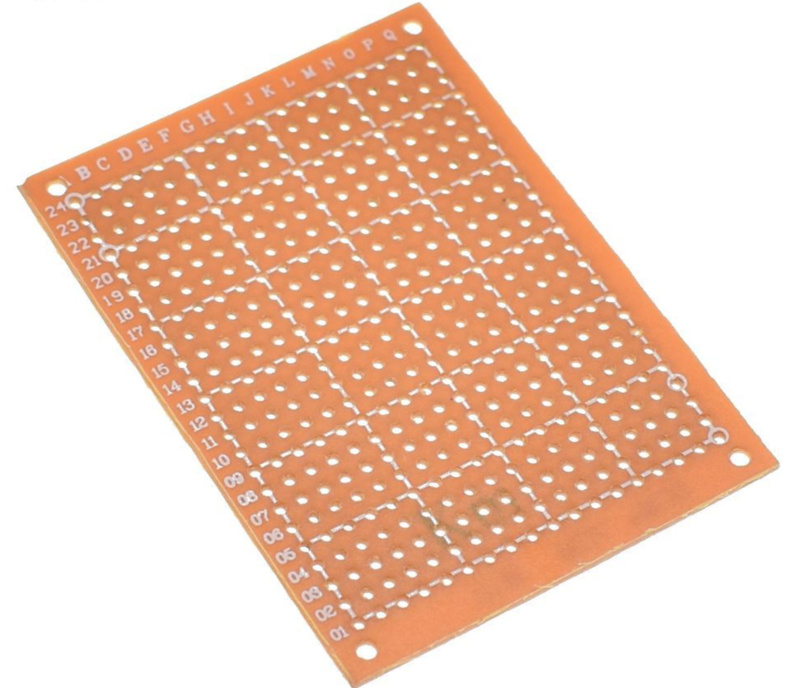 An experimental and prototyping printed circuit board to solder components onto. Perfect for soldering a breadboard experiment and placing it in a plastic housing, for example. Hole spacing: 2.54 mm Hole diameter: 1 mm
