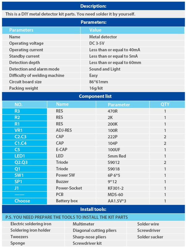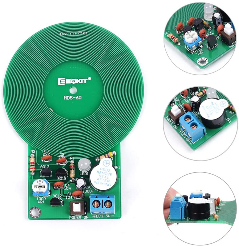 How to Solder a Working Simple Metal Detector by Yourself! Searching for treasure on a tropical beach isn't the only application for metal detectors. In the food industry, metal detectors are used to find foreign metals and machine parts in food. In security, they are used to detect weapons. In manufacturing equipment, they are used for position detection and parts counting. You can even use them for gaming entertainment or a proximity switch on a toy train set. Features: 3 -5V DC Working: 40mA Standby: 5mA Detecting distance: less than 60mm Alarm mode: light and sound 86*61mm The buzzer starts to ring and the red light indicator lights up when the metal is close to the metal detector.