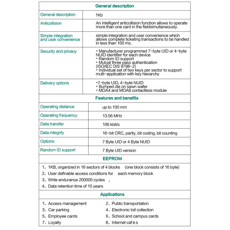 Type: MIFARE ClassicFrequency: 13.56MhzMemory: 1KSuitable for RC522 and PN532Color: White85.5 x 54 x 0.8mm