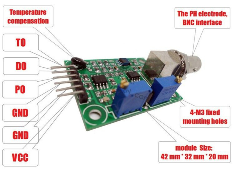 sensor module for measuring the pH values of liquids with a microcontroller. This module amplifies the values measured by a pH sensor (such as the OT3489 Electronic Probe - order separately). This makes it possible to read them out with a microcontroller such as an Arduino or an esp32.Working temperature: -10 ~ 50 (nominal temperature 20)Working humidity: 95% RH (nominal humidity 65% RH)Size: 42 mm × 32 mm × 20 mmHeating voltage: 5 ± 0.2V (AC DC)Working current: 5-10mARange: PH0-14Response time: 5SStabling time: 60SElement power: 0.5W TO – Temperature OutDO – Digital Out Trigger (3.3V)PO – 0-5V Analog Out for PHGND – GroundVCC – 5VDC Input PowerDimensions: 42mm × 32mm × 20mmProvides a 0-5V analog output – perfect for Arduino but also ESP32.Great module for Biorobotics or other projects. For example, make your own IOT/Smart Home Water PH meter in combination with a wifi module. This way you can remotely measure the water quality in a swimming pool, rain barrel, water tank, pond or aquarium.