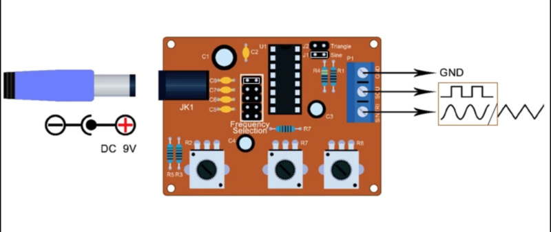 When construction is complete and you are ready to use the function generator, pay attention to the polarity of the power supply. Then, feed 9-12V DC (9V typical) through the DC input.