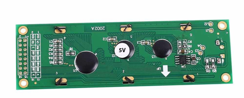 LCD avec rétroéclairage vert/jaune et caractères blancs. 2 lignes, 20 caractères par ligne. Le contraste est (logiciel) réglable.
