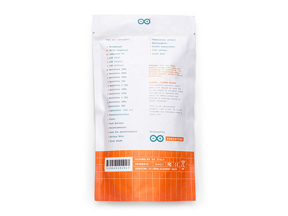 Ce pack comprend des pièces de rechange pour les kits suivants : Arduino Starter Kit Classroom Pack, Arduino Student Kit, Arduino Education Starter Kit, Arduino CTC 101 et ARDUINO CTC GO! - CORE MODULE.