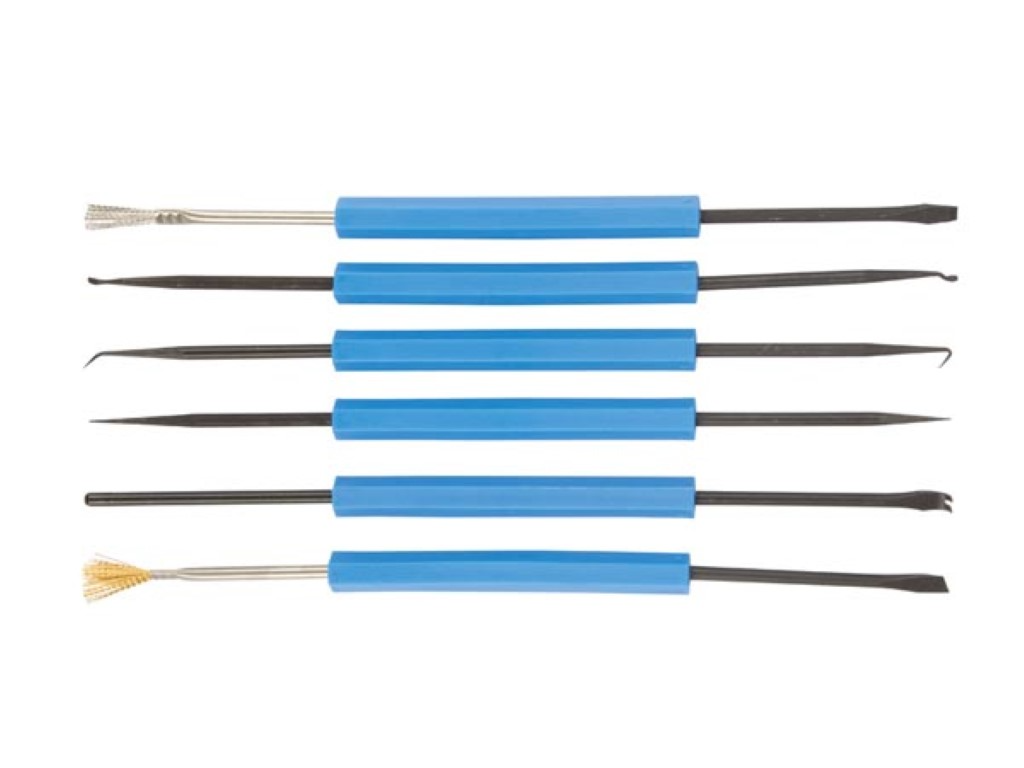 Ce set de nettoyage de soudure 6 pièces contient tous les accessoires nécessaires pour nettoyer en toute sécurité les composants sensibles à la chaleur. Le set se compose d'un couteau, de brosses, d'un grattoir, de crochets, de fourchettes et de pointes d'aiguille.