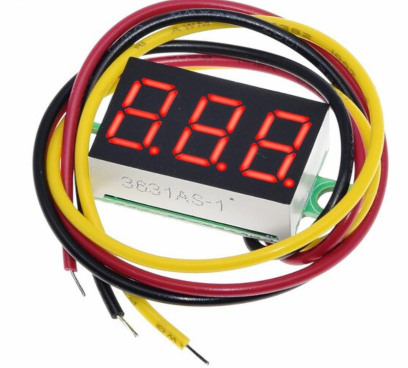 Voltmètre DC avec affichage numérique à 3 chiffres rouges. Connectez-vous directement à une batterie ou à une batterie et l'écran affiche la tension. Avec une tension allant jusqu'à 18 V inclus, les fils rouge et jaune peuvent être connectés ensemble à la source et la tension est également mesurée immédiatement. Pour les tensions supérieures à 18V, cet appareil doit être alimenté séparément. Fil rouge à 18V max pour l'alimentation de l'afficheur et fil jaune pour la tension à mesurer jusqu'à 100V maximum.
