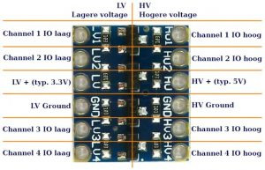 Deze module kan voor 4 kanalen in beide richtingen voltage omzetting doen tussen 1.8V, 2.8V, 3.3V en 5V digitale signalen, zoals seriële data, I2C en ISP (<2Mhz). Voor elk kanaal wordt een N-channel MOSFET gebruikt in de volgende opstelling: