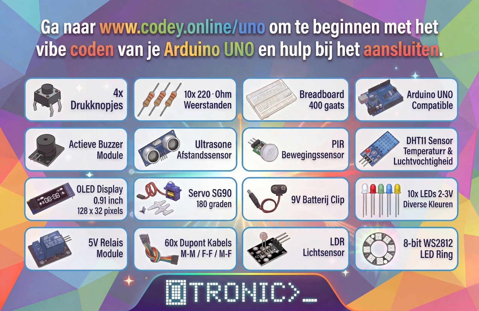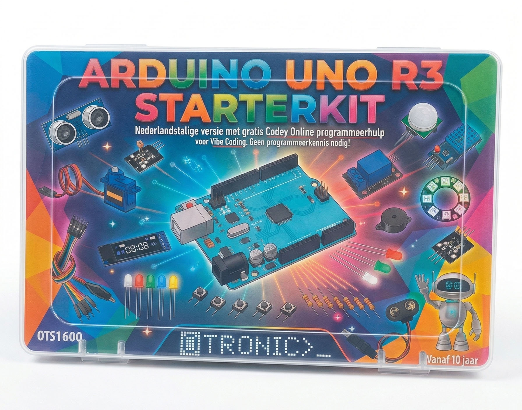 Complete Nederlandstalige Arduino Starterkit UNO R3 inclusief sensoren, LED's, relais en gratis toegang tot Codey Ai Vibe Coding voor eenvoudig programmeren en innovatieve projecten.Lees meer