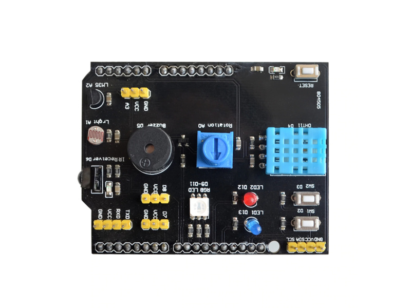 Een heel leerzaam shield voor Arduino UNO met diverse functies om snel de mogelijkheden van de Arduino te ontdekken zoder allemaal draadjes in een breadboard te hoeven steken.