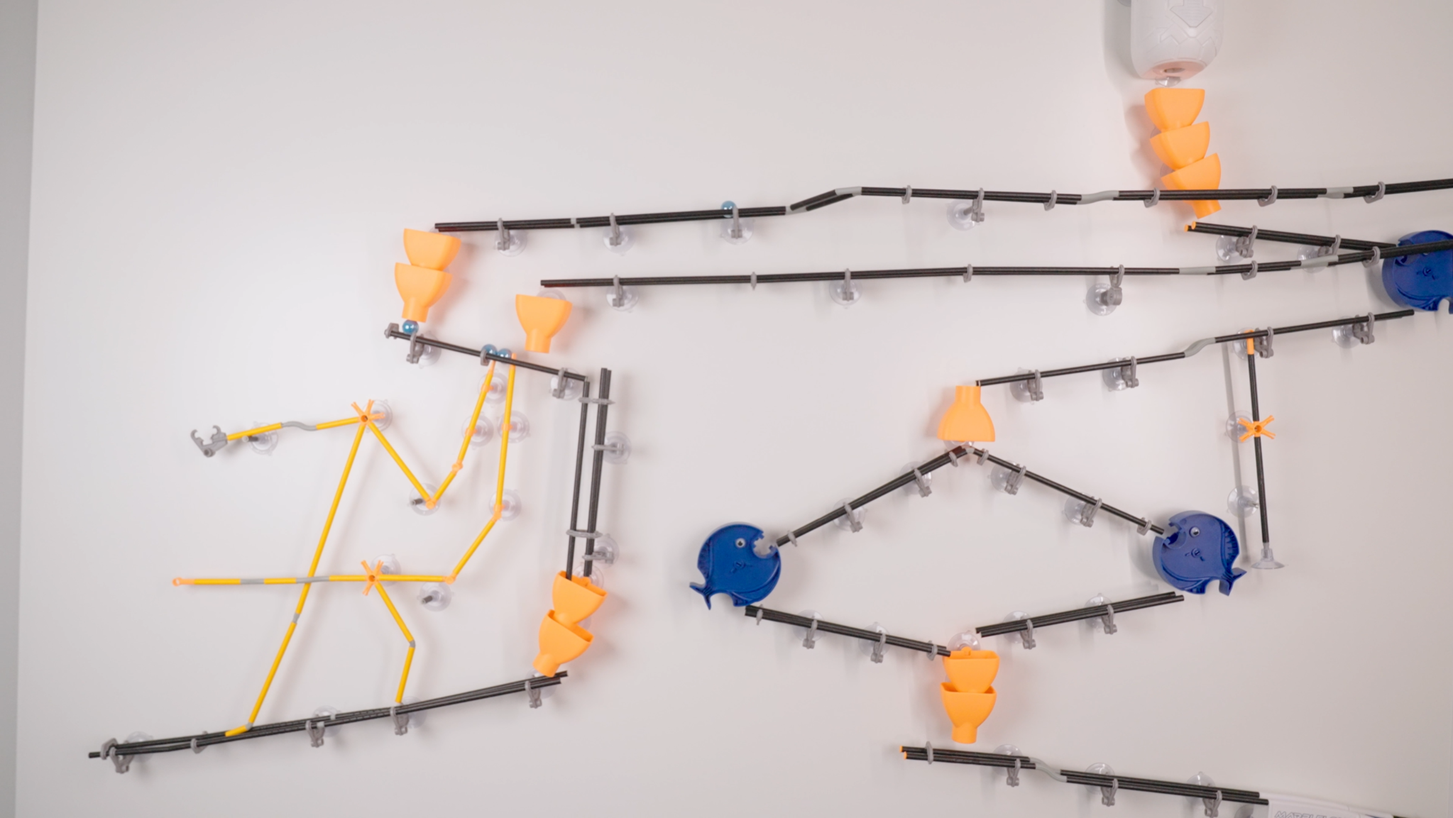 - Bouw knikkerbanen van meer dan 10 meter met buizen, bochten en connectors
