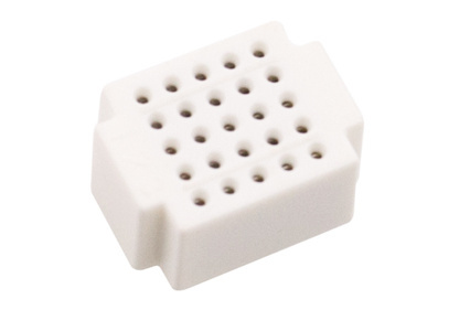 Wit minibreadboardje met 25 gaatjes, een ideaal formaat voor de kleine experimenten.